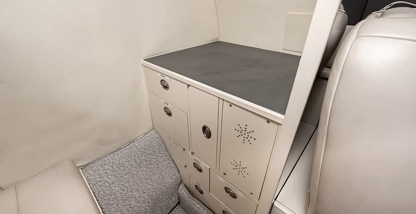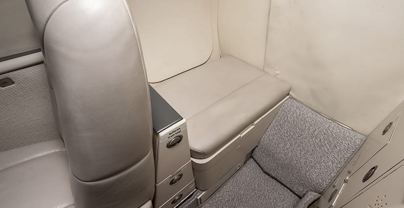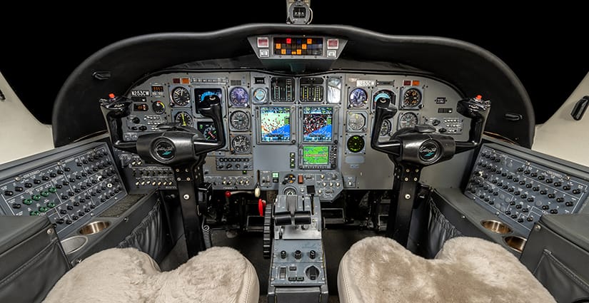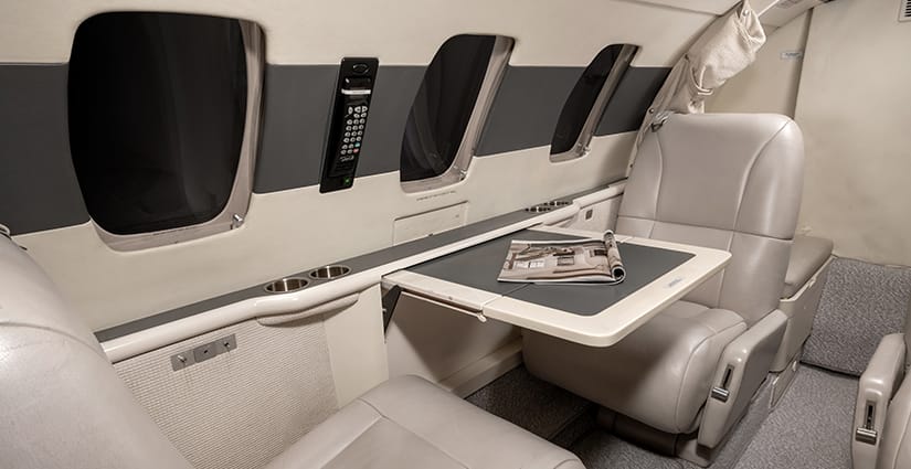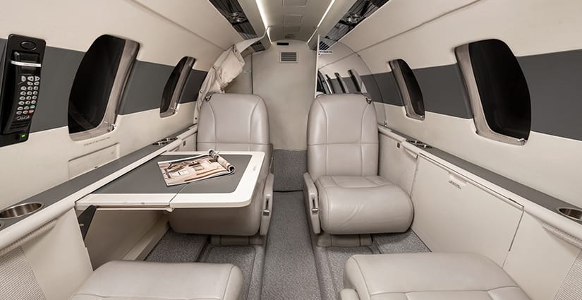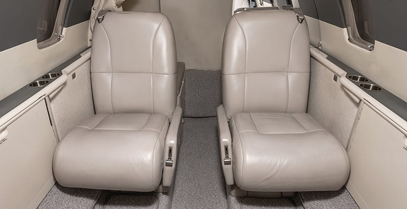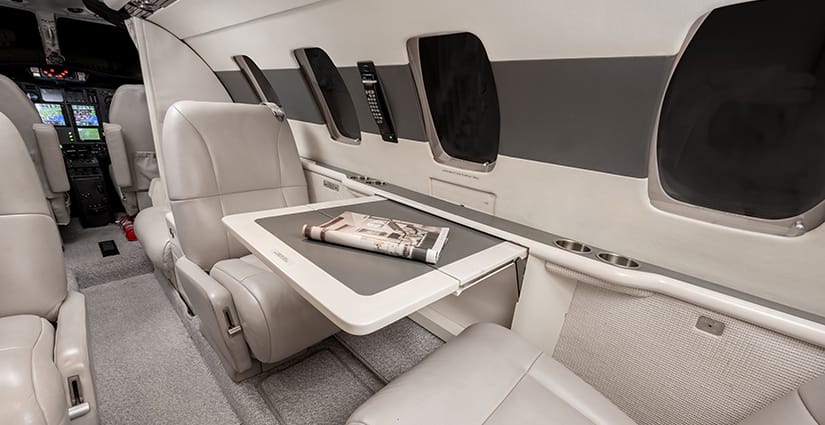 The five passenger executive interior is configured with a four place club in the main cabin and a single side-facing seat at the forward entry. All seating is completed in light gray leather. The aft lavatory is located behind a privacy curtain. Cabin furnishings include dual executive fold-out writing tables and a forward refreshment center with storage. The headliner and upper sidewalls are completed in ivory.