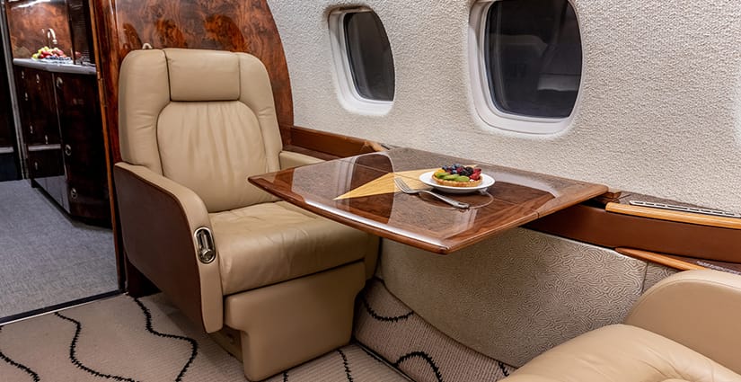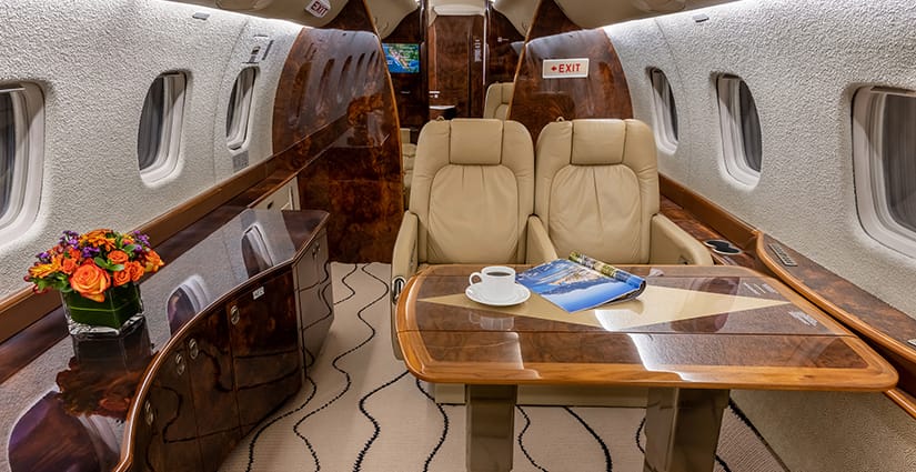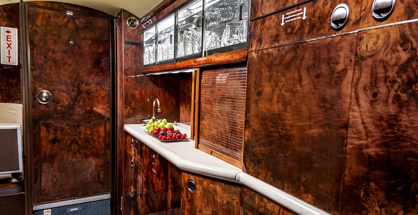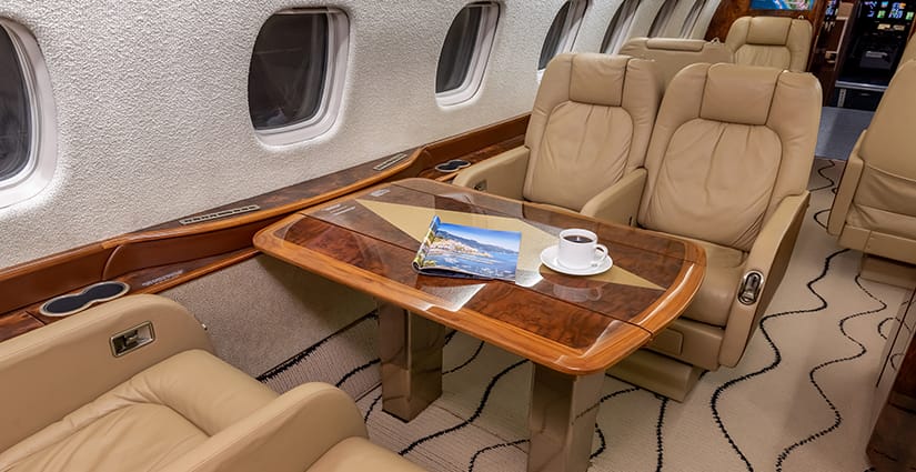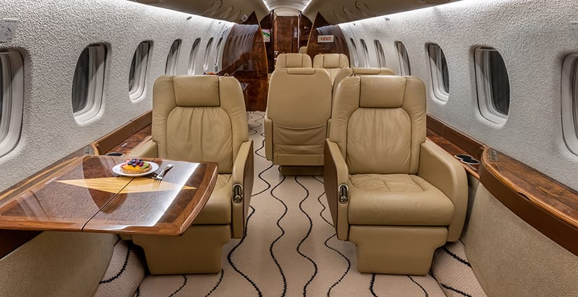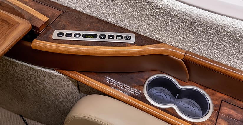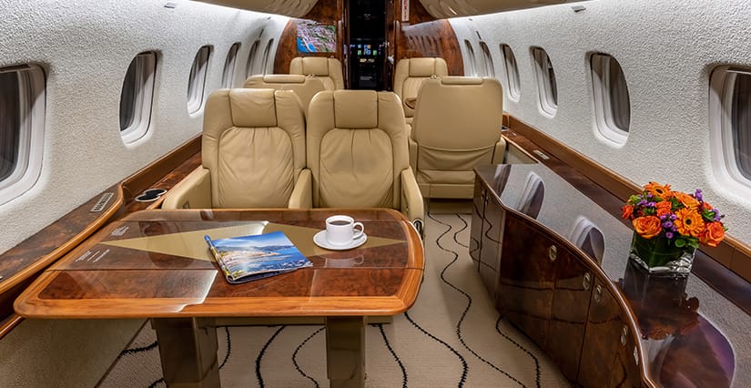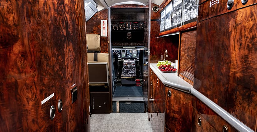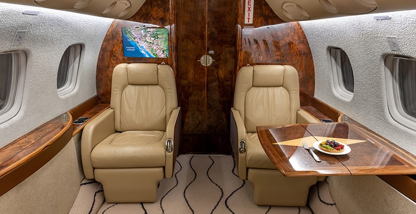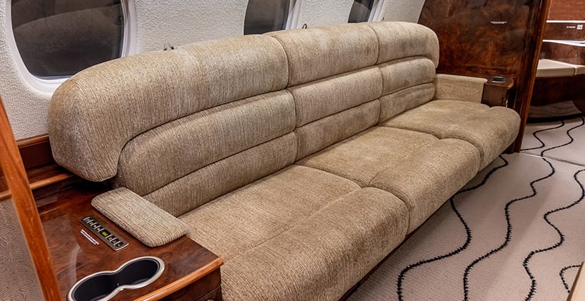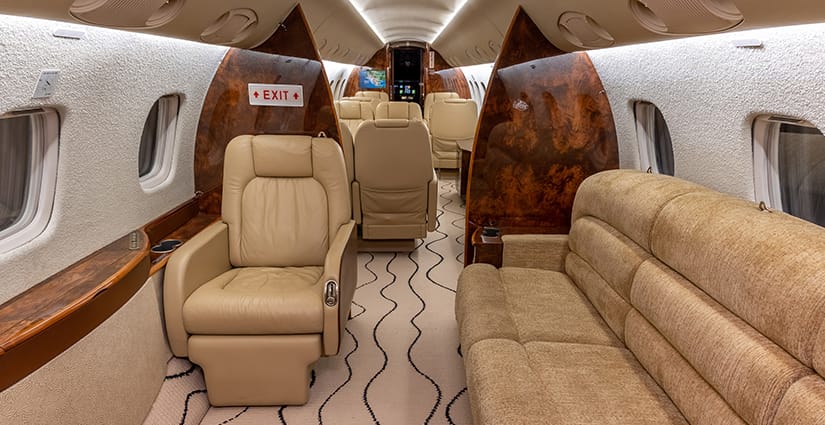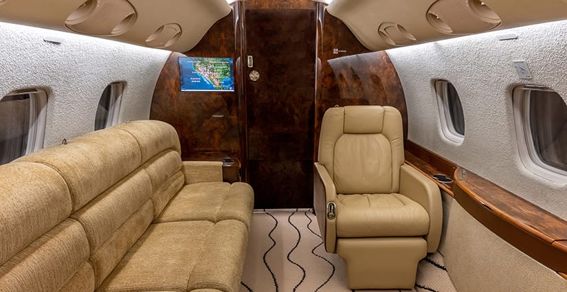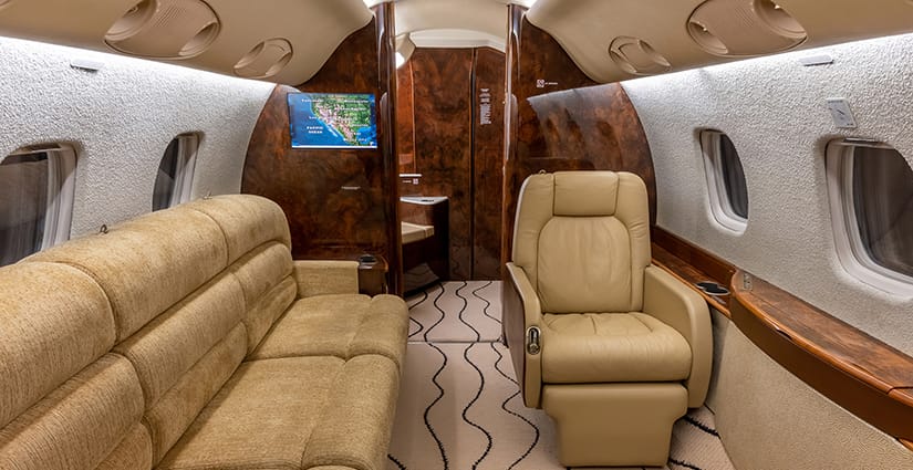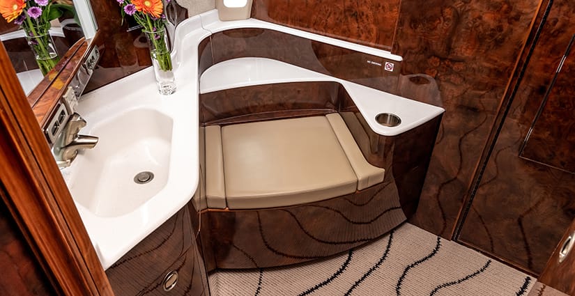 The thirteen passenger interior is configured with a forward four place club arrangement, a mid-cabin four place conference table across from a full width burl credenza, and an aft three place divan opposite two club seats. All single seats are completed in glove-soft Champagne leather, with the divan finished in a tonal woven Sand fabric. The headliner is finished in Cream Ultraleather, with Oyster White textured sidewalls and a Beige cut-pile carpet with a Black wave pattern throughout. Cabinetry is finished in deep, high gloss burl veneer and is complemented with brushed nickel metal hardware. The forward galley features glass front upper cabinets, a Cream Corian countertop with sink and faucet, a tambour door storage compartment, and ample lower cabinet and drawer storage. Individual entertainment control panels include a call button, reading light, DVD source, and headphone output and are integrated into each sidewall console, with dual bulkhead mounted large LCD monitors displaying moving map and inflight entertainment for all zones. There is a forward flight attendant jump seat, forward crew lavatory, and a fully enclosed aft lavatory for passenger privacy.