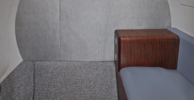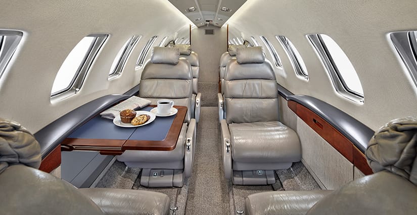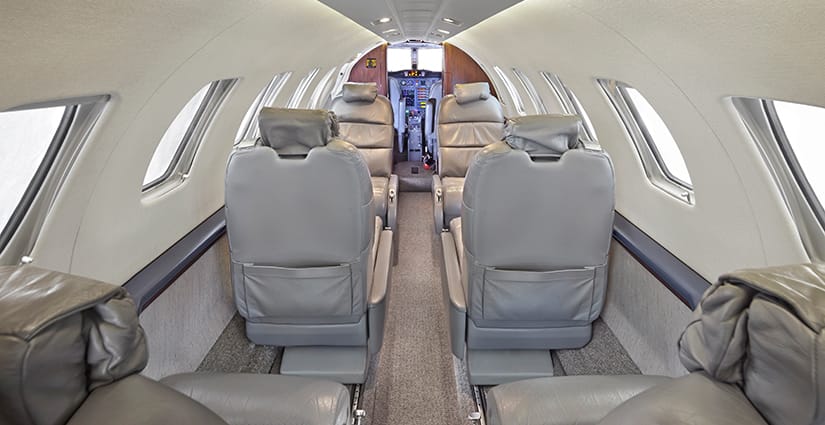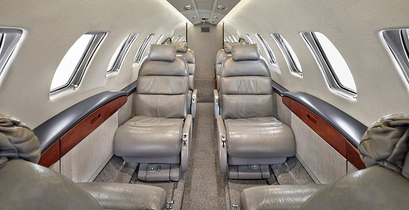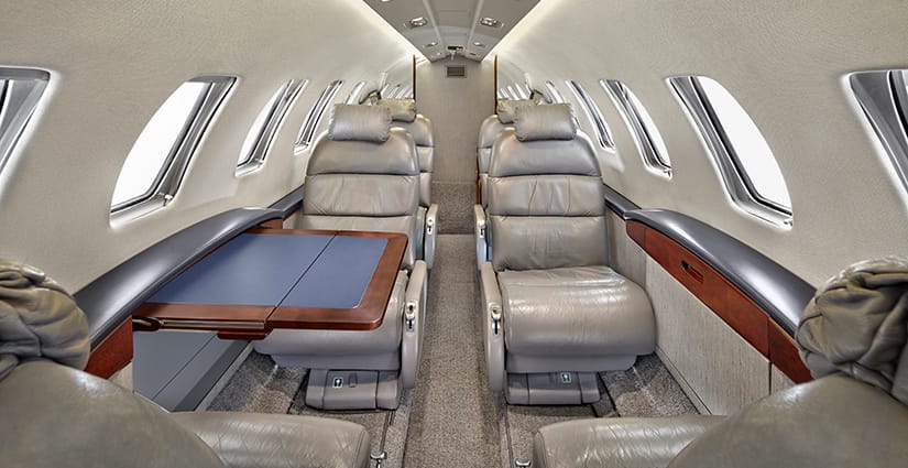 The seven passenger interior features a four place center club configuration and two seats located aft facing forward. All seating is completed in gray leather. The aft lavatory includes a belted flushing toilet. Cabin furnishings include a large right-hand forward refreshment center, dual executive tables, indirect cabin lighting and mirrored aft divider. All cabinetry is completed in high gloss laminate with wood veneer accents on sidewalls.